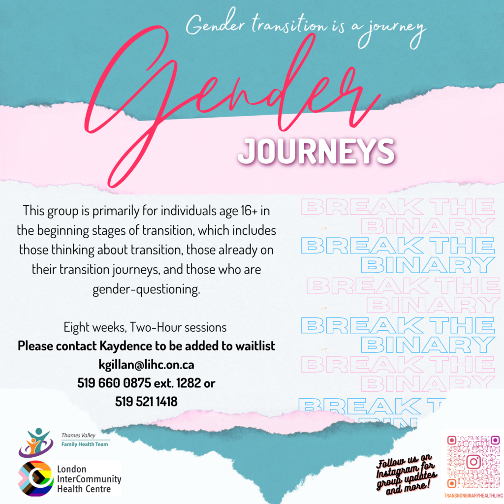 New session coming soon: If you would like to join the list for the next group, please email your full name, preferred name, email address, and phone number to Kaydence Gillan at London InterCommunity Health Centre: [email protected] or call 519-660-0875 ext. 1282.